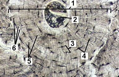 1. Haversian system 2. Haversian canal 3. A bone lamella 4. Lacunae 5. Concentricly arranged lamellae 6. Canaliculi |