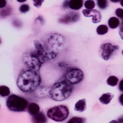All blood cellular elements develop from stem cells in the bone marrow and go through a complicated maturation process before released into the circulation. The development of red blood cells and platelets are known as erythropoiesis and thrombopoiesis respectively, while white cell development is normally divided into granulopoiesis, monopoiesis and lymphopoiesis. The presence of precursors in the systemic circulation is rare and usually indicates serious pathology. The one exception is the appearance of the reticulocytes, immediately preceding mature red blood cells. These cells are often used as an indicator of red bone marrow activity. The only cell we would expect you to know and recognize in a bone marrow smear is the megakaryocyte. This is a large cell up to 100?m in diameter. The irregular multilobar nucleus contains dispersed chromatin and does not display any nucleoli. The cytoplasm is extensive and contains fine basophilic granules. |