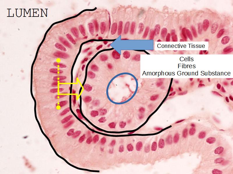 View the slides at low magnification. You should be able to see several layers, stained different colours and intensities. For a standard haematoxillin and eosin stained slide, there are three layers: