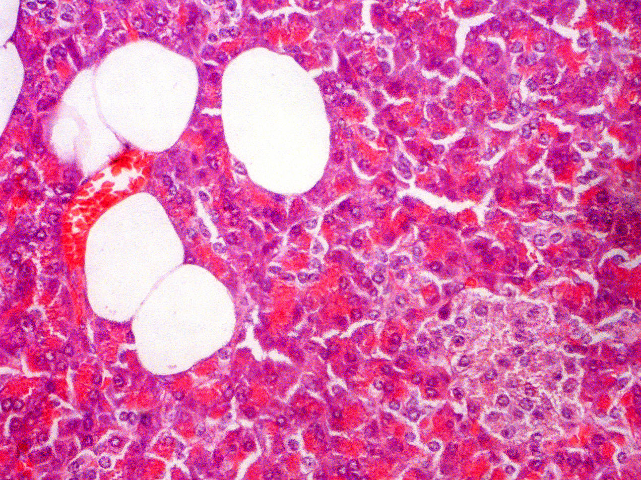 A fat cell has a single nucleus placed eccentrically in the cell. No other nuclei are visible. No intimal layer is visible around the fat globule that comprises the bulk of the cell. Fat cells border each other or are directly in contact with surrounding tissues without the layers seen in blood vessels.