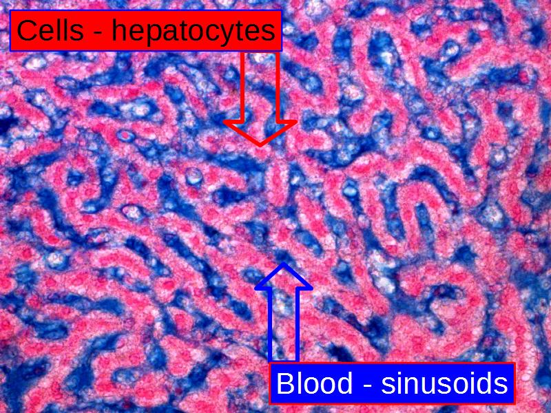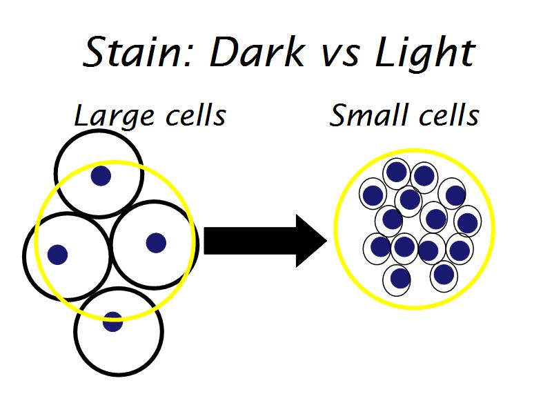 View the slides at low magnification. You should be able to see several layers, stained different colours and intensities. For a standard haematoxillin and eosin stained slide, there are three layers: